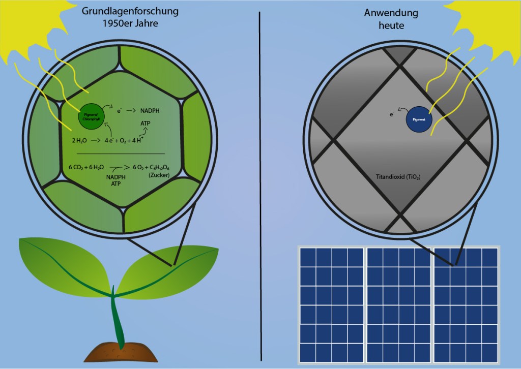 Wie der Prozess der Photosynthese genau verläuft und wie das Prinzip für die Farbstoffsolarzelle verändert wurde, findet ihr hier.