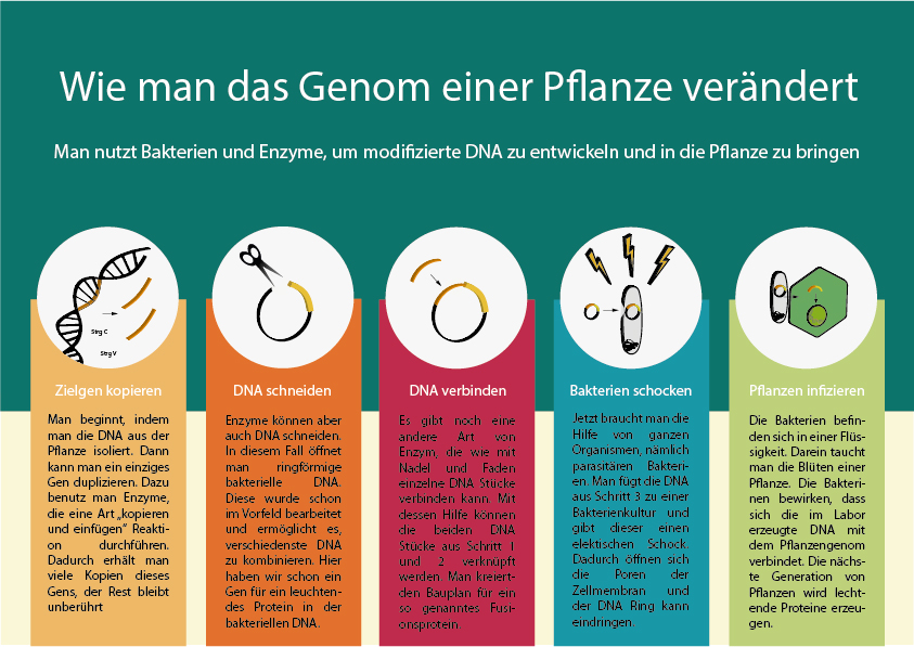 Das Herstellen von GMOs folgt bestimmten Prinzipien, unabhängig von der Art des Organismus, der verändert wird. Wissenschaftler können im Labor die DNA eines Lebewesens entnehmen. Dann können wir Änderungen daran vornehmen und die neue genetische Information wieder zurück in das Geschöpf geben. Danach können wir beobachten, ob Veränderungen auftreten. Da ich mit Pflanzen arbeite, habe ich sie als Beispiel genommen, um den Prozess im Detail zu erklären.