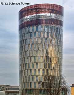But back to the basics; The research on the principle of photosynthesis took a long time. In the 1950th the puzzle of this biochemical reaction was finally solved. And one of the scientists, professor Calvin, was awarded the Nobel Prize for his findings in 1961. But the story does not end here. The gained knowledge was used to find a technical application. During photosynthesis, sunlight causes an electrical charge, when it reaches pigments in a leaf. These electrons are directly used, to fuel the biochemical reaction that results in the production of oxygen. In principal, plants can produce electricity. The swiss scientists, professor Grätzel and his team, make use of this principle to produce clean energy. They were able to build solar panels in which sunlight creates an electrical charge, when it reaches the pigments. The electrons are then transported by the carrier material inside the panels. This way, they can be integrated into a current circuit. Electricity is created, that can be used by all kinds of devices that are connected to it. The principle is similar to that of classical silicon based solar panels. But the amount of electricity that is won with the photosynthesis-based technology is much higher. In addition, the panels are much flatter and can have any kind of shape. In current tests of long-term endurance, the panels are used as part of the facade of houses. Like for the facade of the Gratz Science Tower.