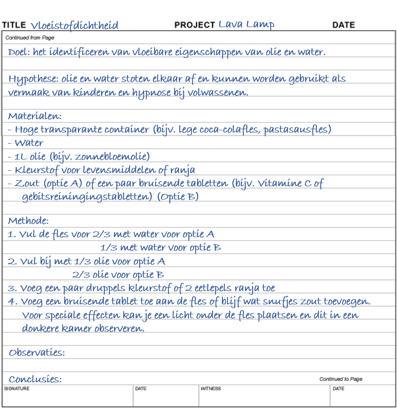 Volg het onderstaande laboratoriumprotocol. Of er nu kinderen bij betrokken zijn of volwassenen voor wie dit een alternatief is voor een spelletjesavond, moedig alle deelnemers aan om na te denken over wat er gebeurt en waarom. Waarom mengen de twee vloeistoffen niet? Waarom is er alleen beweging als we zout of een bruistablet toevoegen? Hoe verschilt dit van een echte lavalamp en wat veroorzaakt dat verschil? Zoals elke andere wetenschapper, kunnen jullie jullie observaties en conclusies opschrijven.