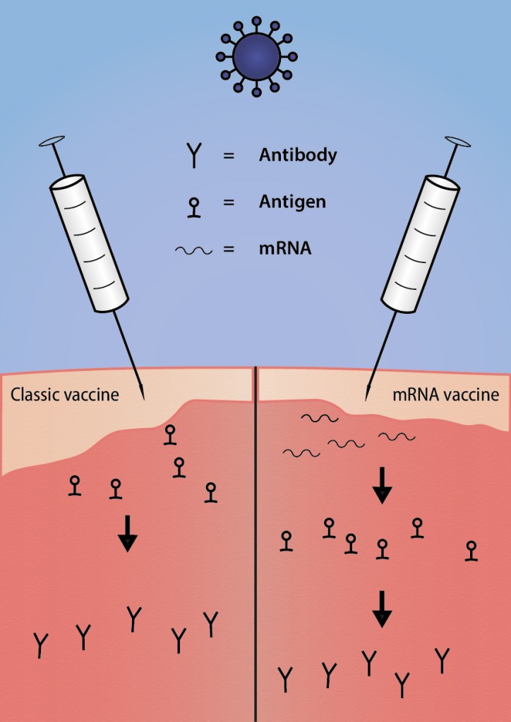 Scientists first needed to crack the building plan of the virus, its genetic code, to make the mRNA vaccine. It will contain those parts of the building plan that encode the information for the development of the virus’ envelop, and thereby antigen. The cells of the injected person will produce this envelop and this will cause the immune reaction. The idea is copied from the virus itself. It injects its building plan into our cells and forces them to build new, functioning virus that makes us sick.